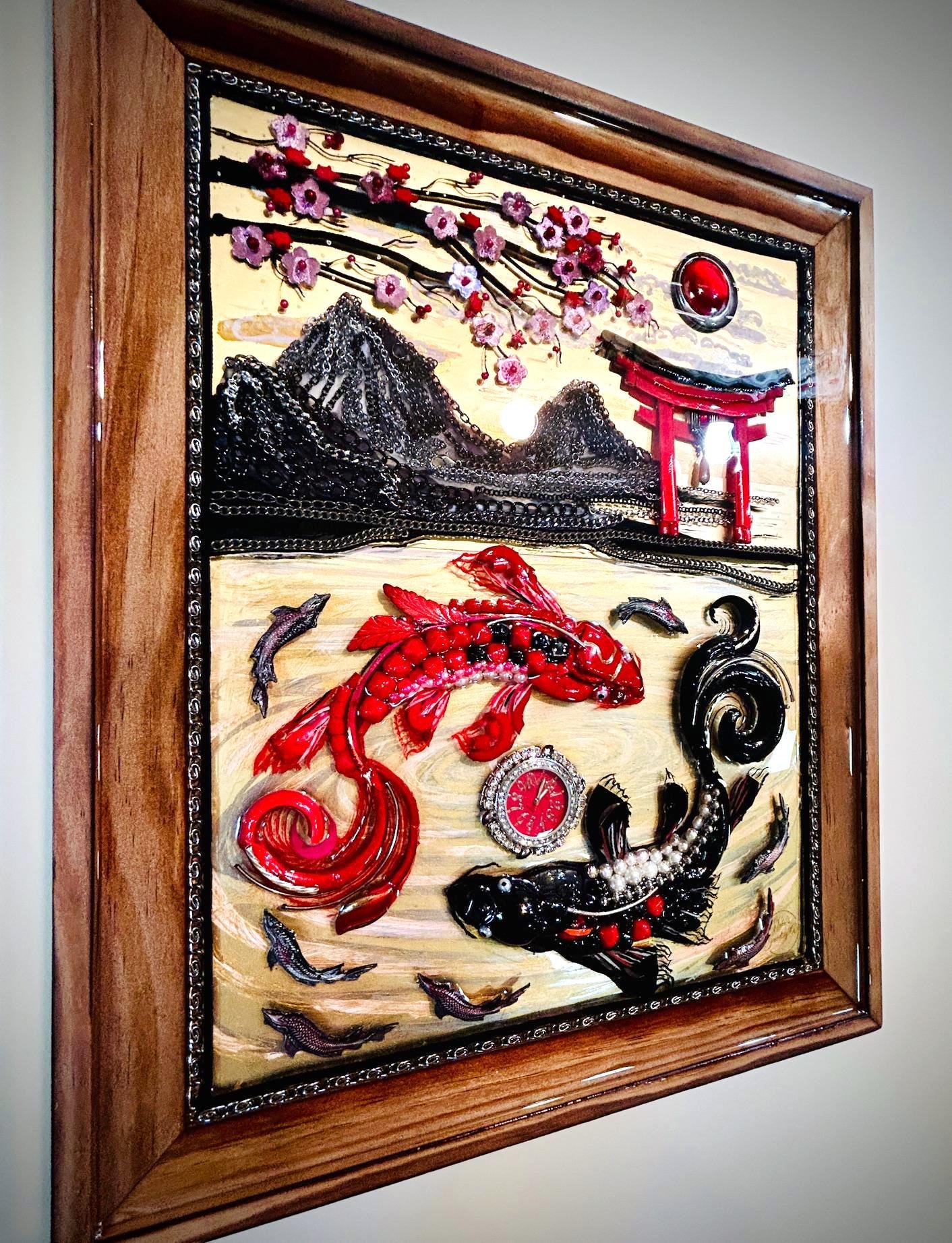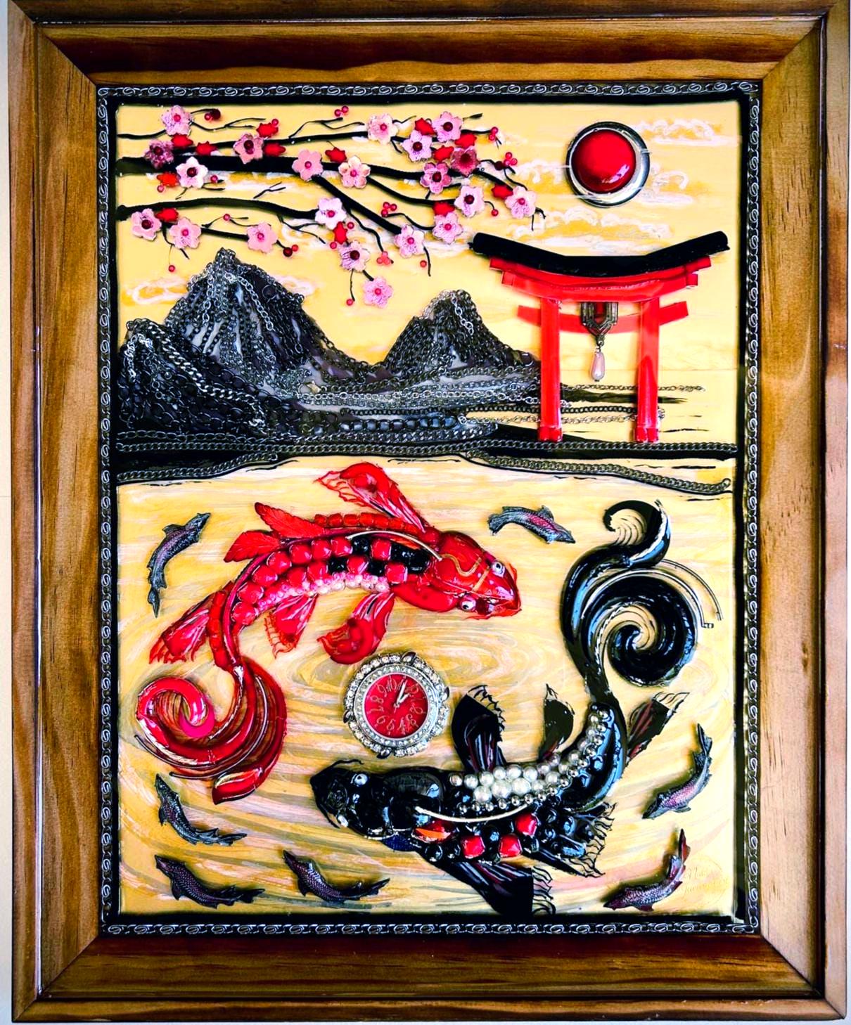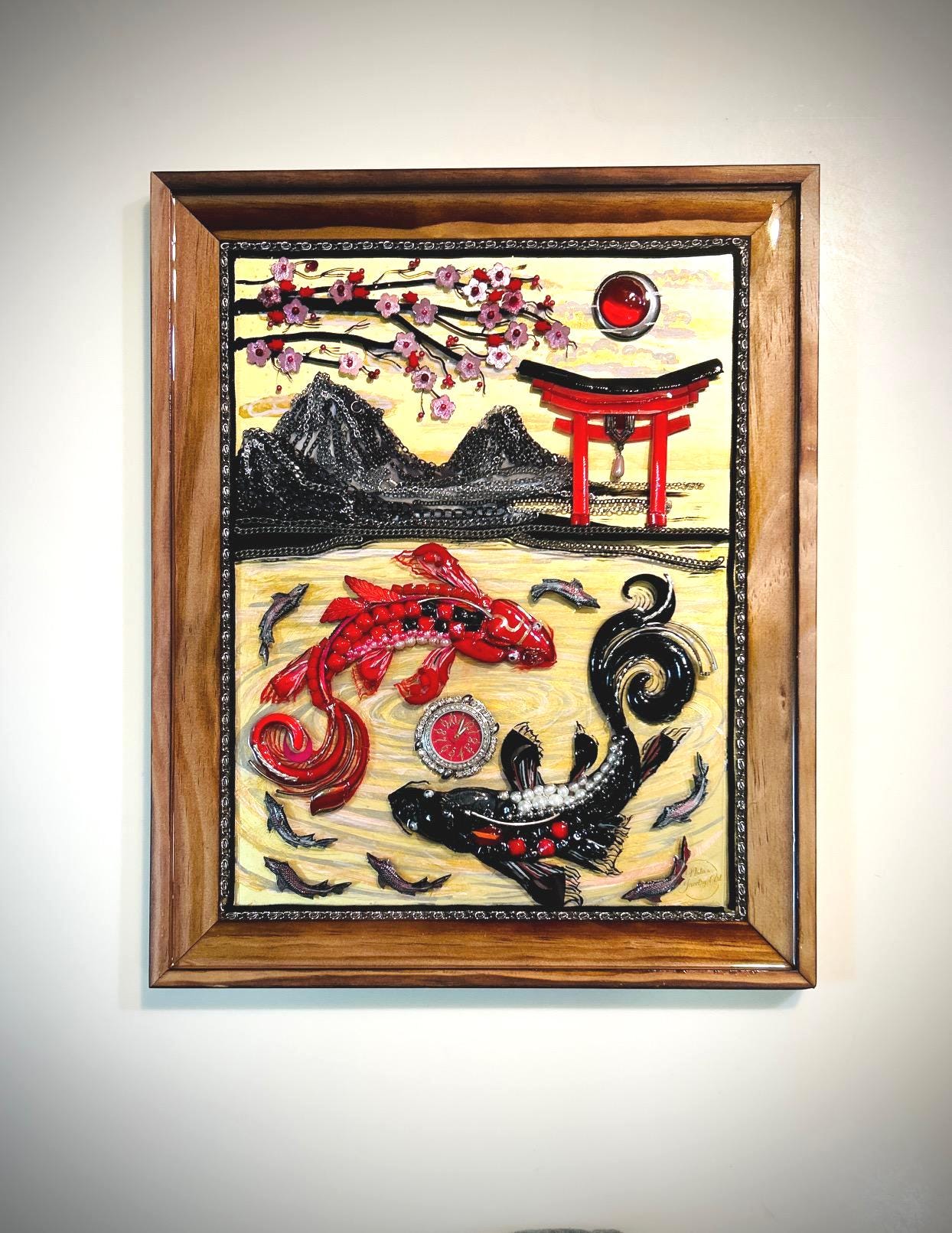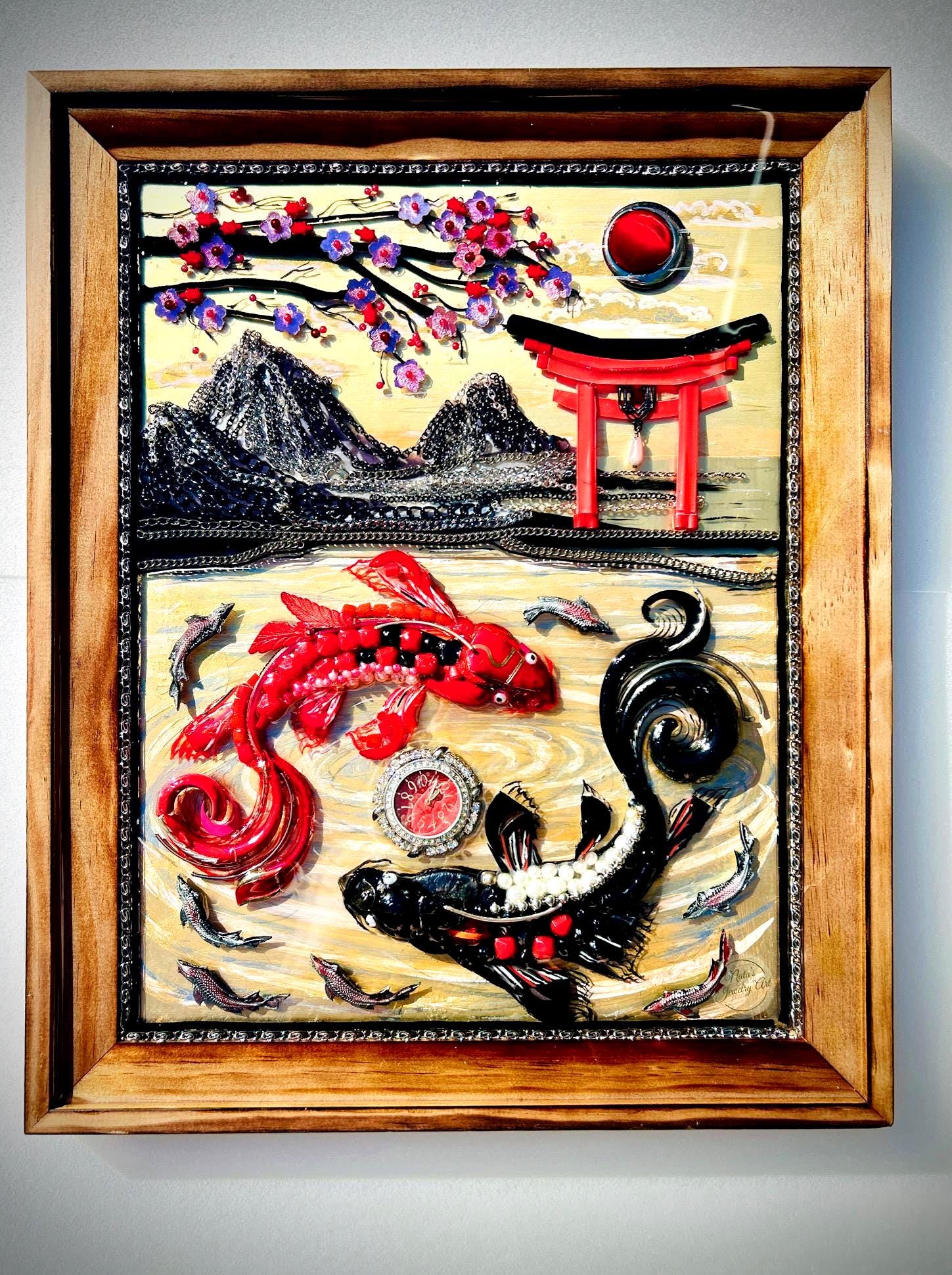 It is done in many beads, chains, yarn, watch, and jewelry pieces on over acrylic painting in wood frame.