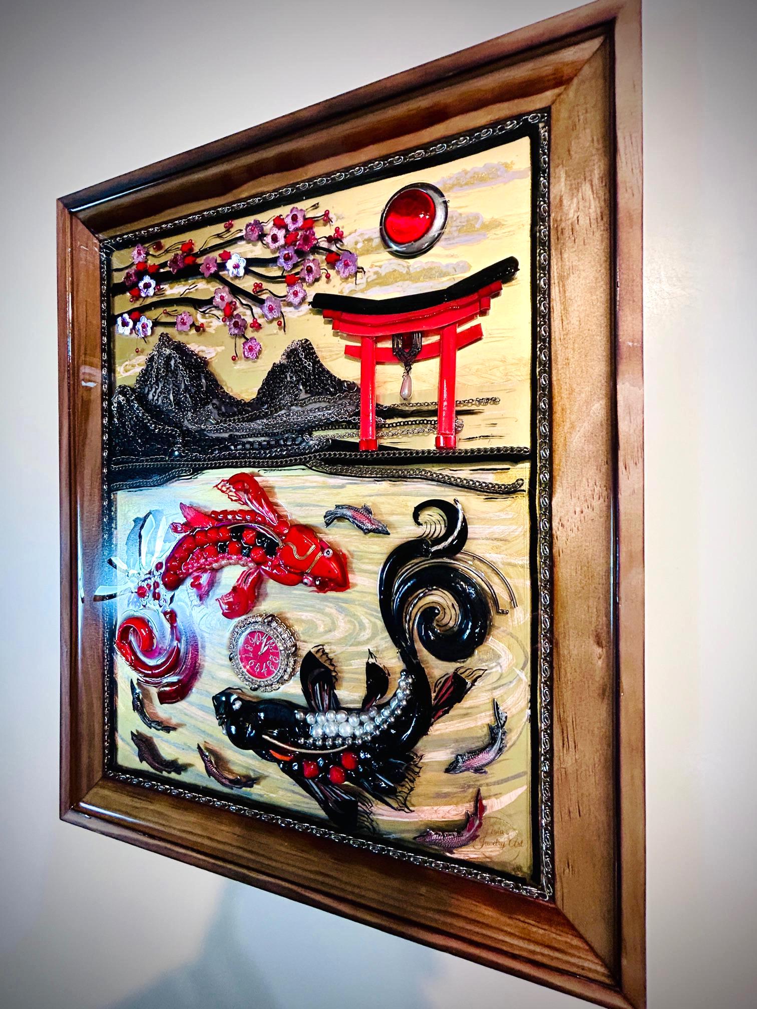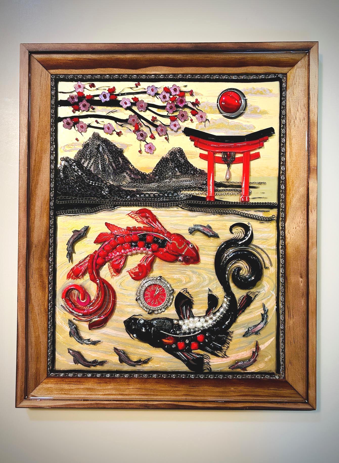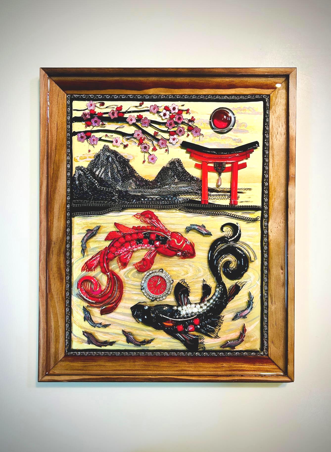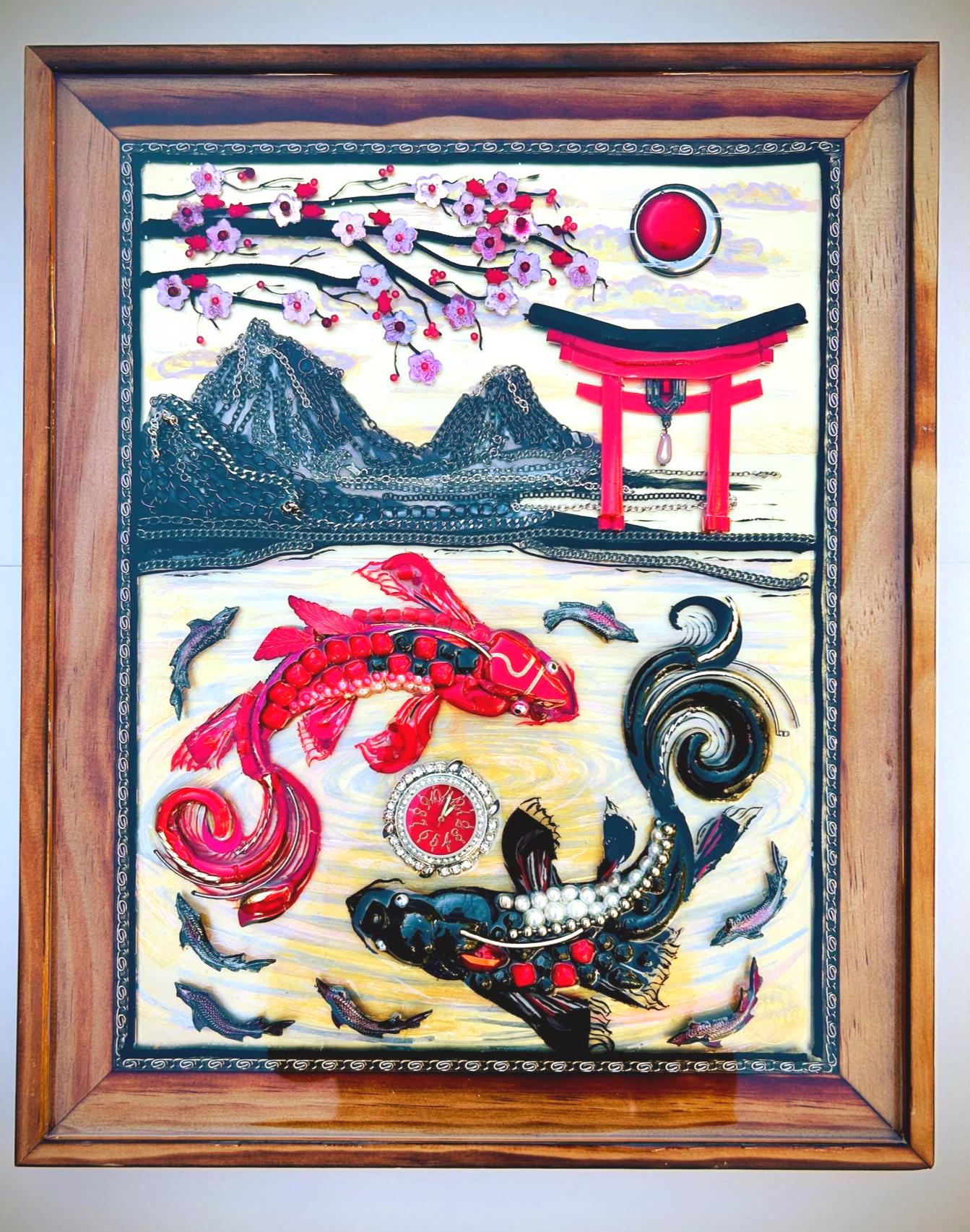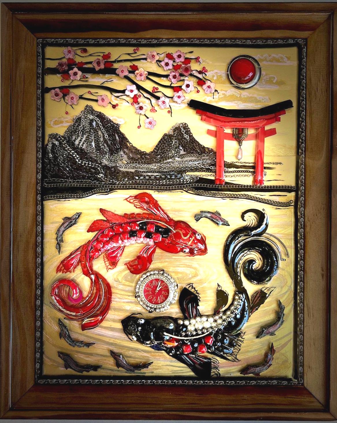 It is done in many beads, chains, yarn, watch, and jewelry pieces on over acrylic painting in wood frame.